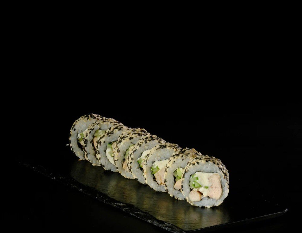 Рис, нори, жареная курица, свежий огурец, спайси соус, микс кунжута, унаги соус