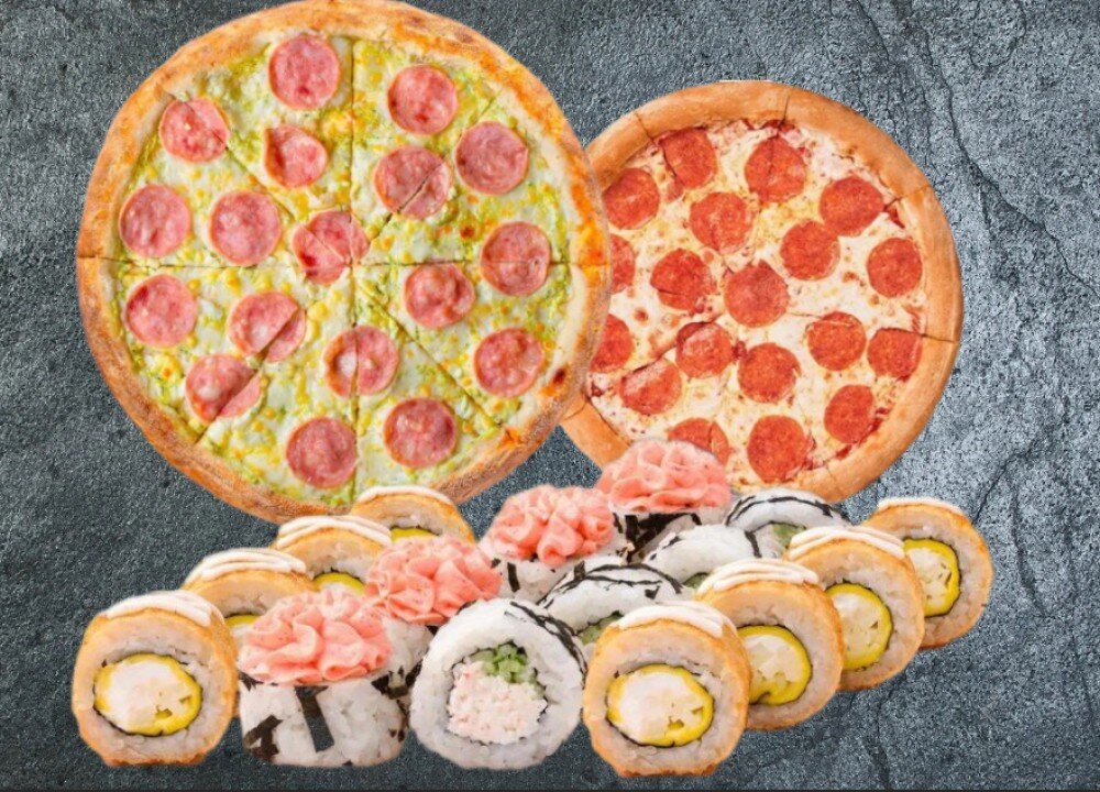 Сет Малыш Пицца пепперони 25см Пицца ветчина 25 см 1 порции Васаби, 1 порции Имбирь, 1 порции Соевый соус, 1 пара палочек