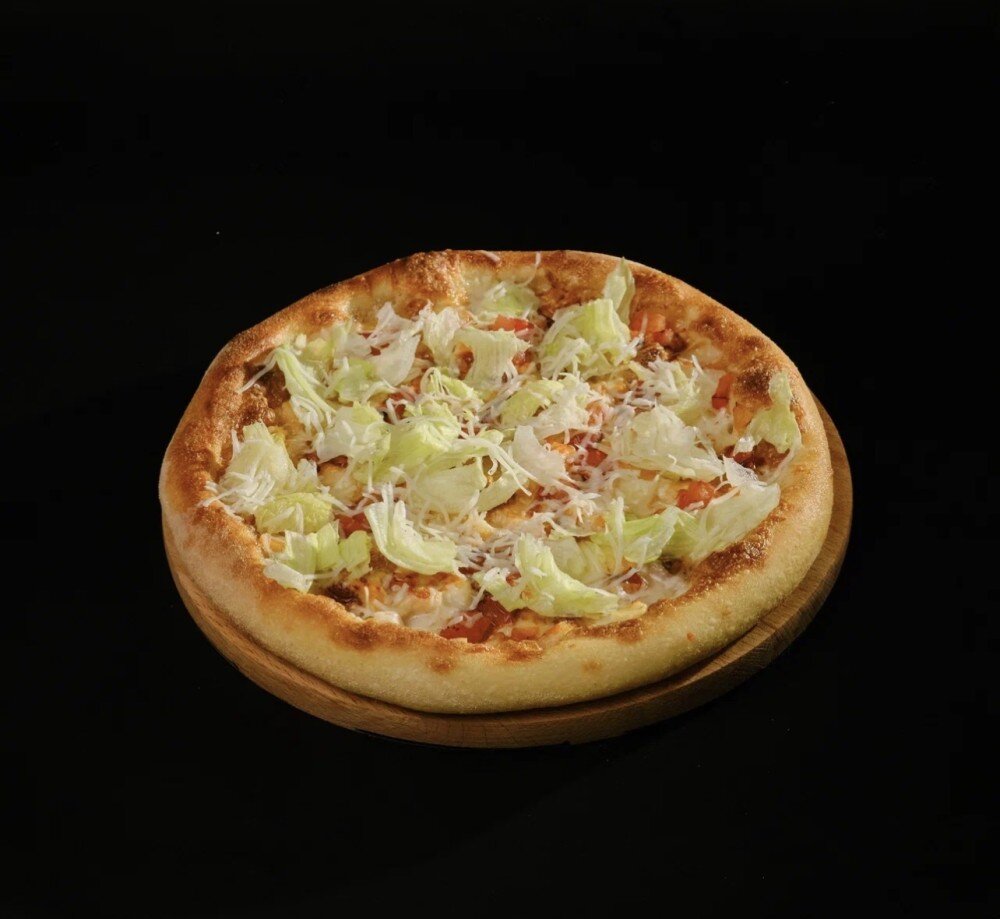 Тесто, куриное филе, соус цезарь, сыр моцарелла, салат айсберг, свежие помидоры, сыр Гауда