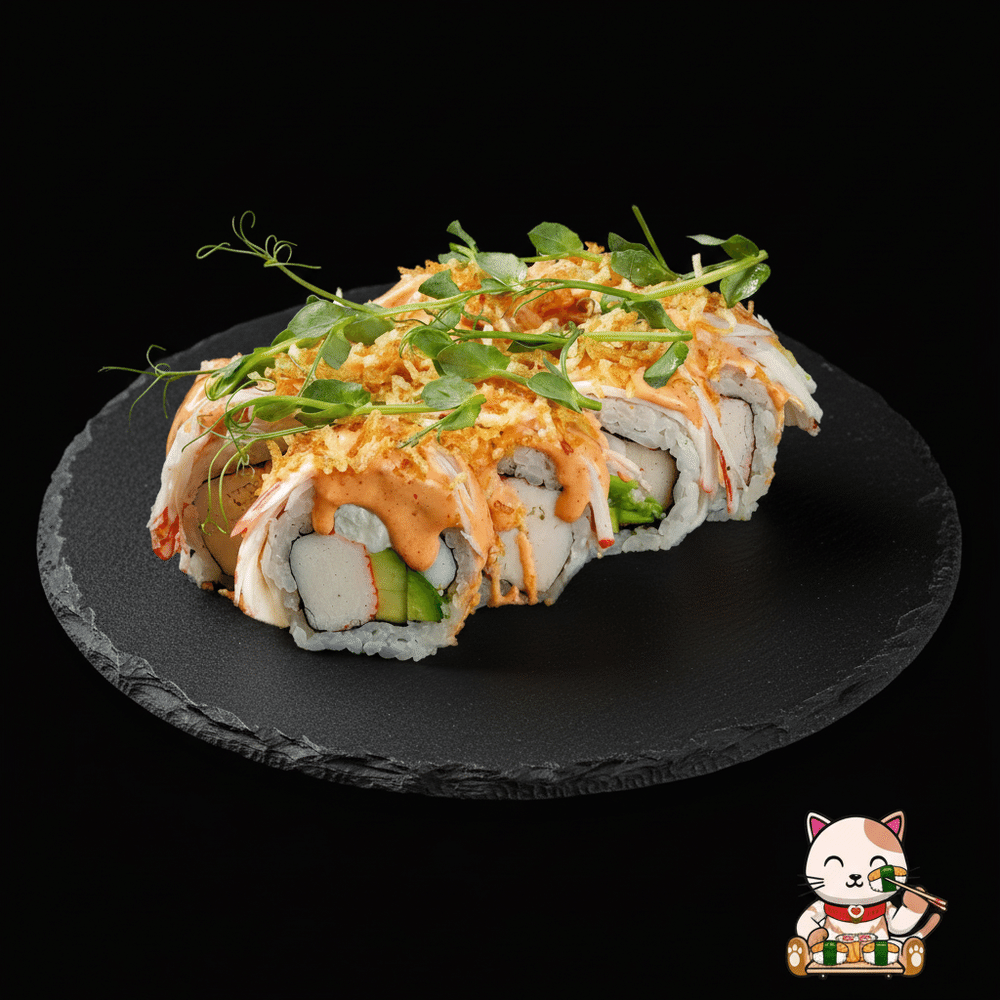 Рис, нори, снежный краб, нежный авокадо, тигровая креветка, сливочный краб, соус спайси, лук фри
