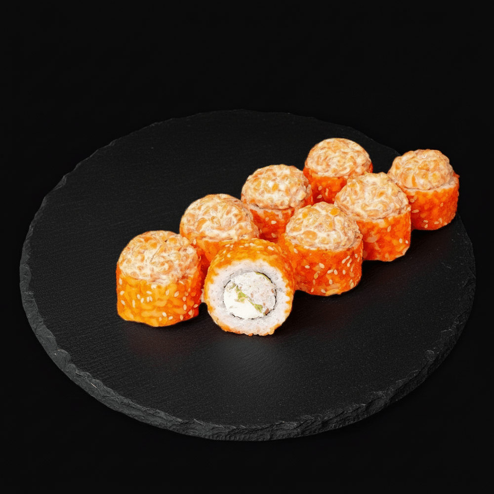 Рис, нори, снежный краб, сыр сливочный, пекинская капуста, икра масаго, кунжут, соус спайси, свежий лосось