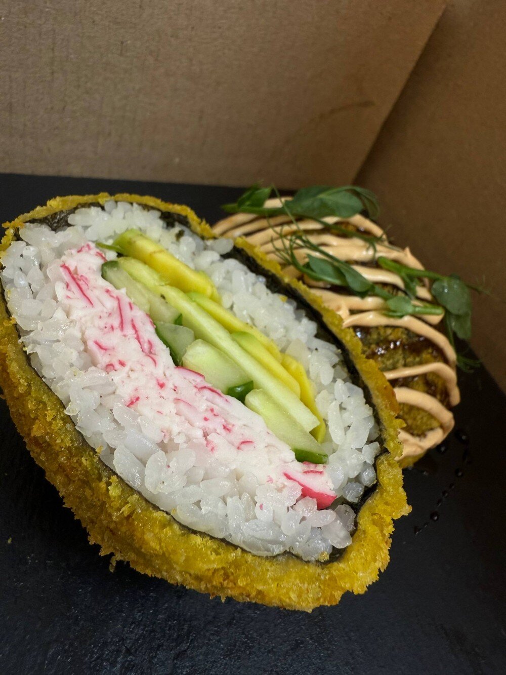 Рис, нори, нежный авокадо, хрустящий огурец, салат айсберг, плавленный сыр, кляр, сухари панко, соус спайси, соус терияки