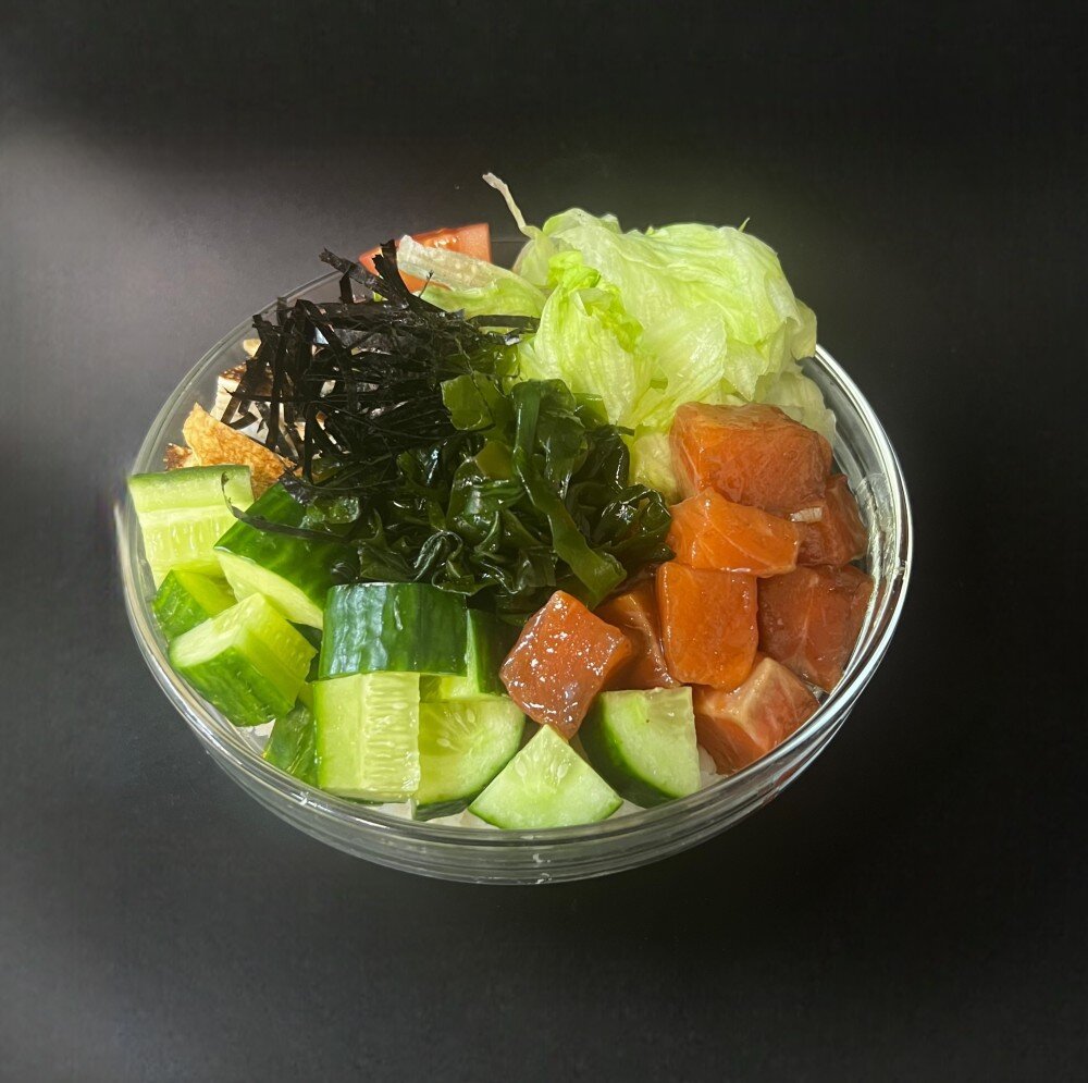 Рис, маринованный лосось, водоросли вакаме, тамаго, огурец, помидоры, салат айсберг, соус на выбор, нори
