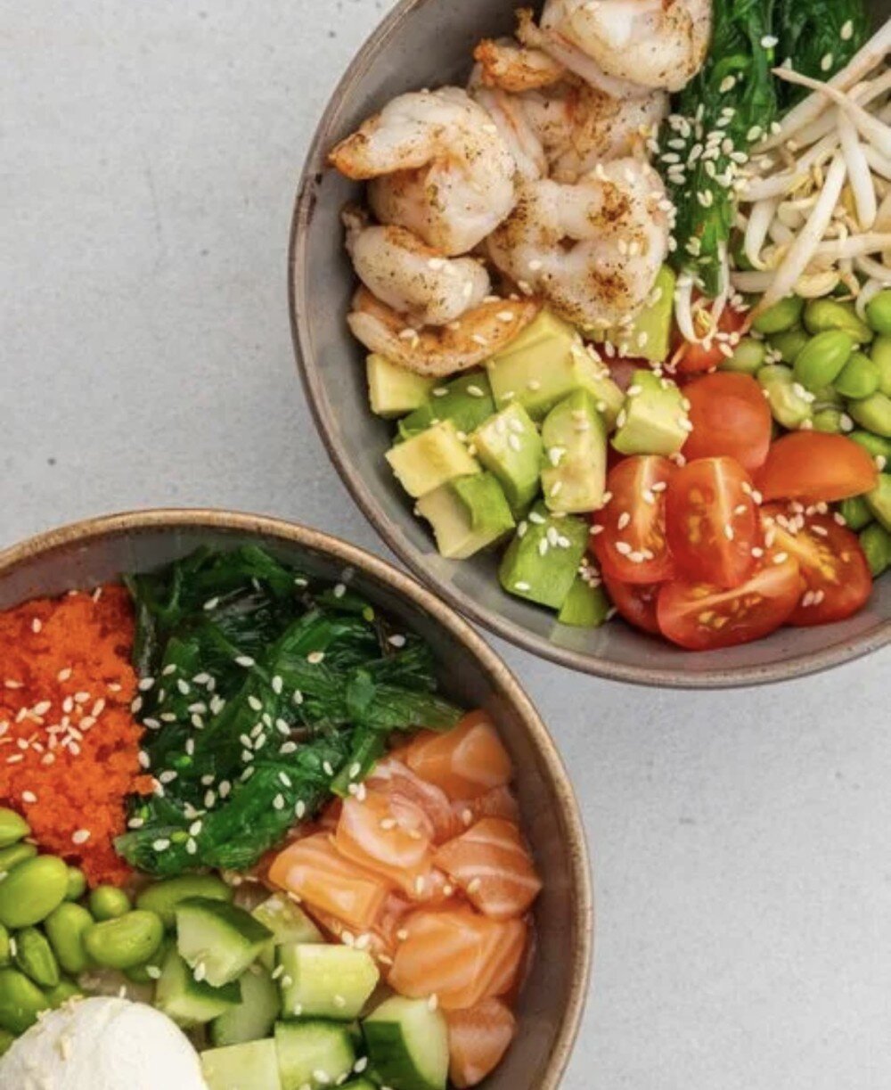 Удон, маринованный лосось, тигровая креветка, огурец, салат айсберг, авокадо, перец болгарский, тамаго, водоросли вакаме, соус на выбор, стружка тунца, кунжут, нори