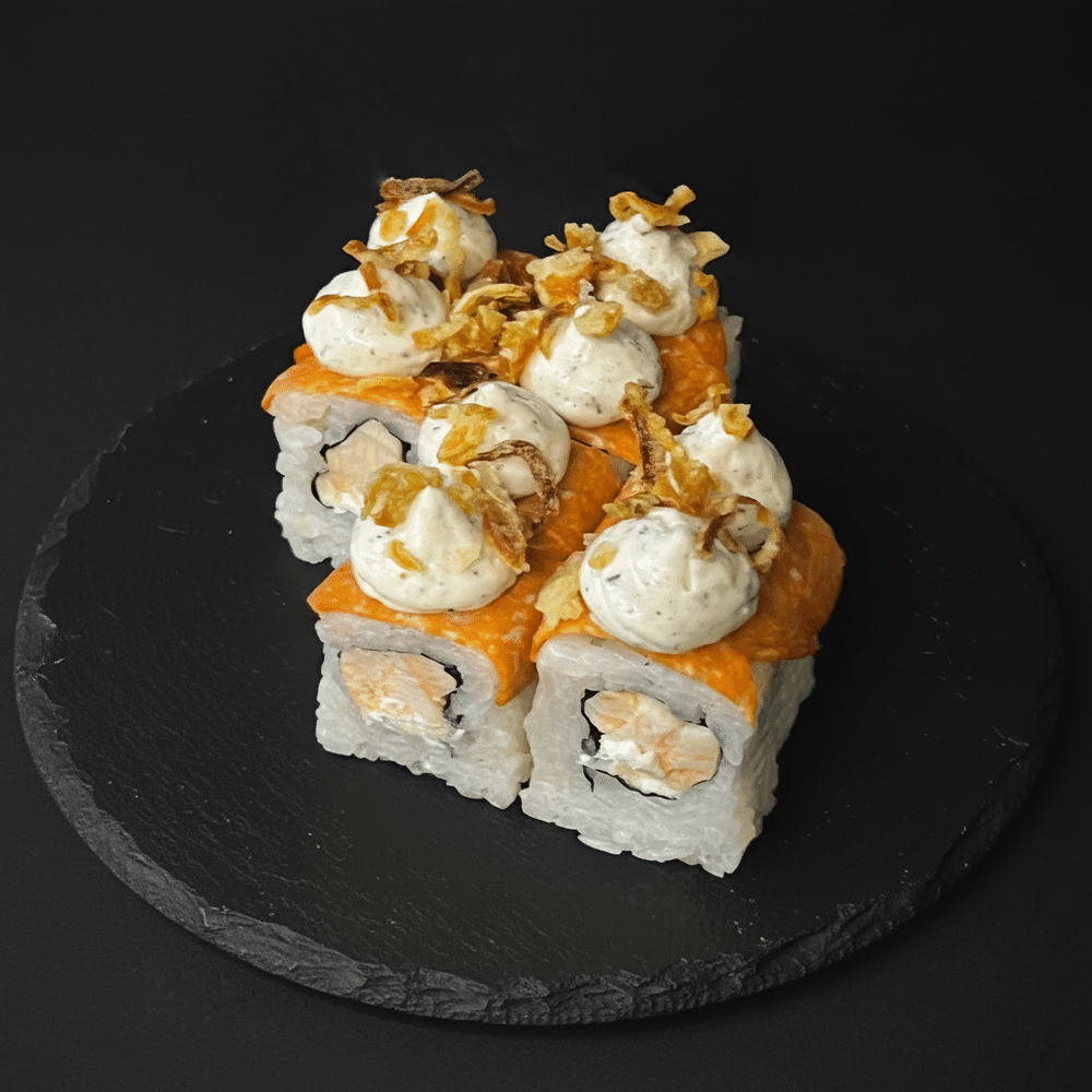 Рис, нори, пепперони, куриное филе, сыр сливочный, лук фри, соус чесночный