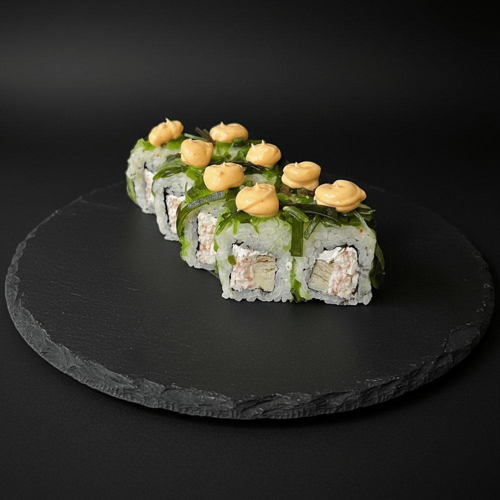 Рис, нори, чука, сыр сливочный, снежный краб, омлет тамаго, соус спайси