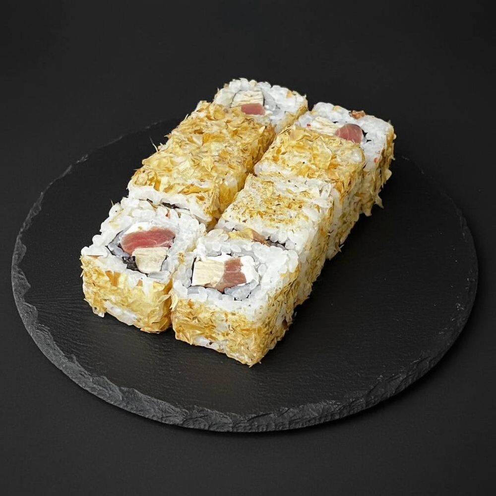 Рис, нори, тунец, сыр сливочный, омлет тамаго, стружка тунца