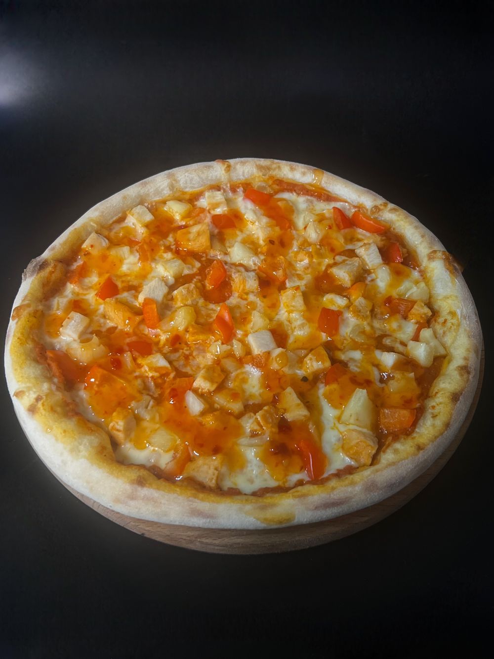 Тесто, соус томатный карри, куриное филе, сыр моцарелла, соус сладкий чили, перец сладкий, ананас консервированный