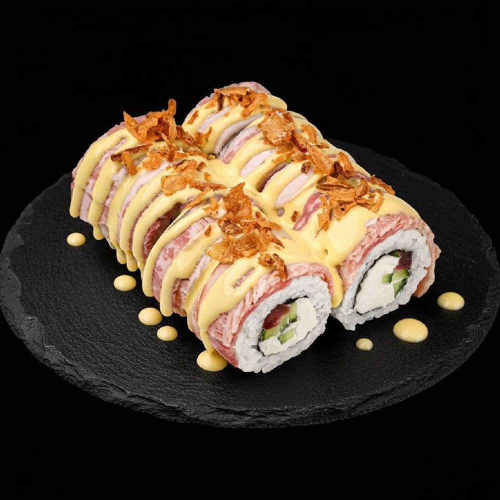 Нори, рис, сыр сливочный, Пекинская Капуста, бекон, сырный соус, лук фри