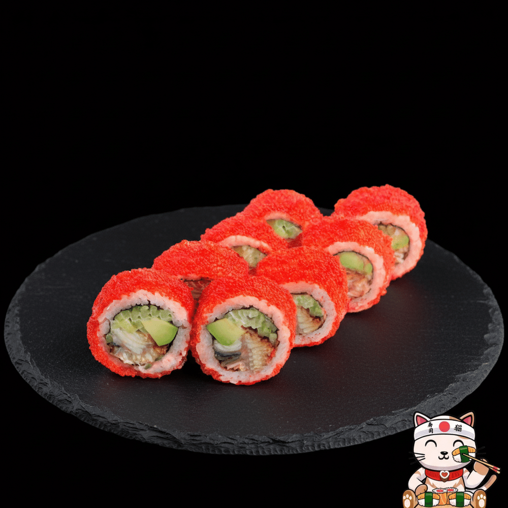 Угорь, рис, нори, икра масаго, авокадо, огурец, терияки