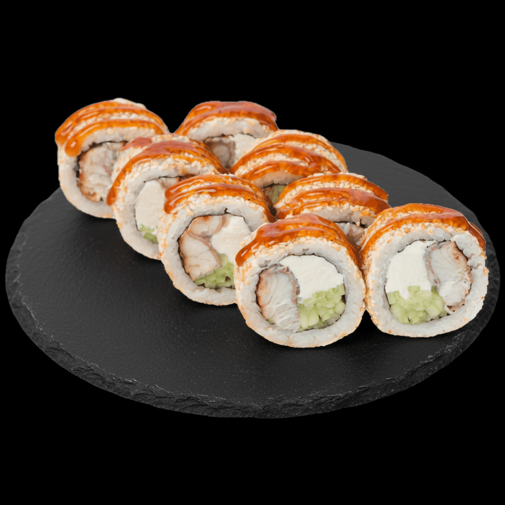 Угорь, рис, нори, кунжут микс,сыр сливочный, огурец, соус терияки