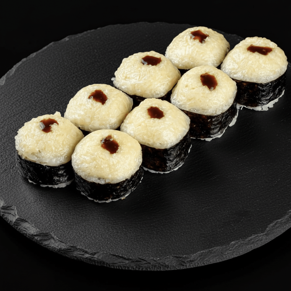 Рис, нори, сливочный сыр, свежий огурец, жареная курица, соус воздушный, соус унаги