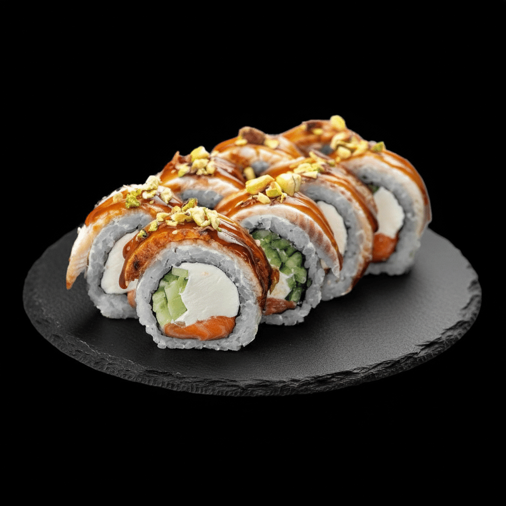 Рис, нори, сыр сливочный, свежий огурец, лосось, угорь, унаги соус, миндальные лепестки