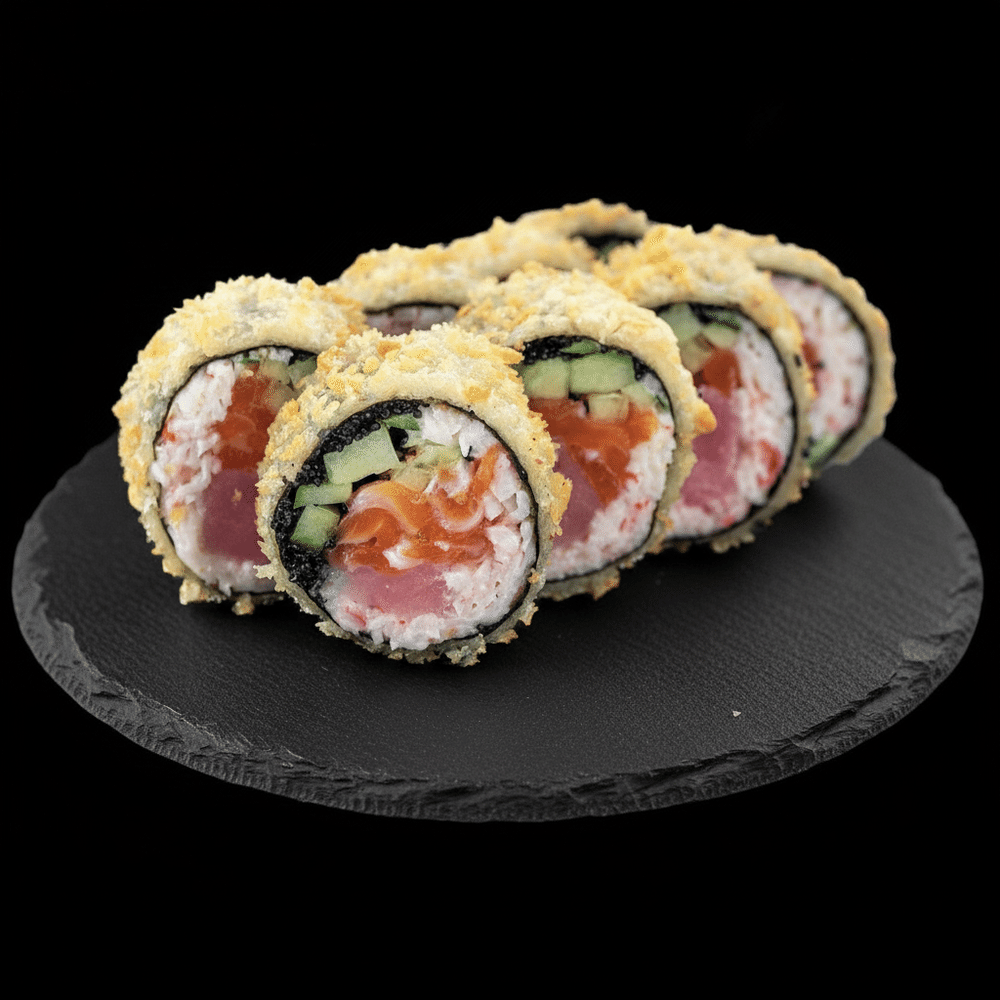 Нори, лосось, тунец, снежный краб, свежий огурец, икра масаго, панировочные сухари, кляр