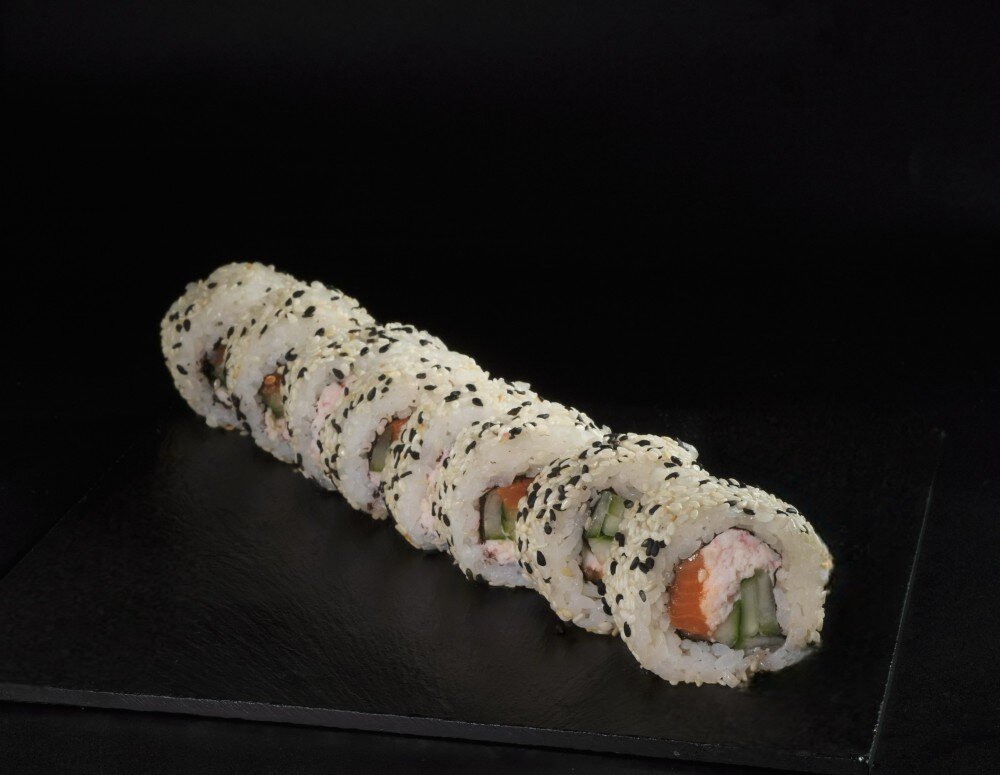 Рис, нори, снежный краб, свежий лосось, свежие огурцы, микс кунжута