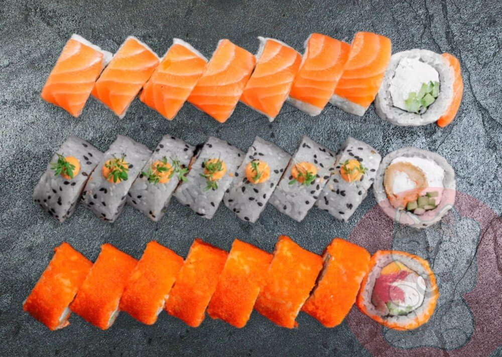Ролл Аризона Ролл Калифорния с лососем Ролл Филадельфия ЭКО 2 порции Васаби, 2 порции Имбирь, 2 порции Соевый соус