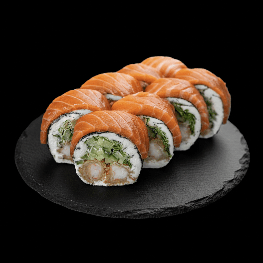 Нори, креветка темпура, свежий огурец, китайская капуста, сыр сливочный, лосось