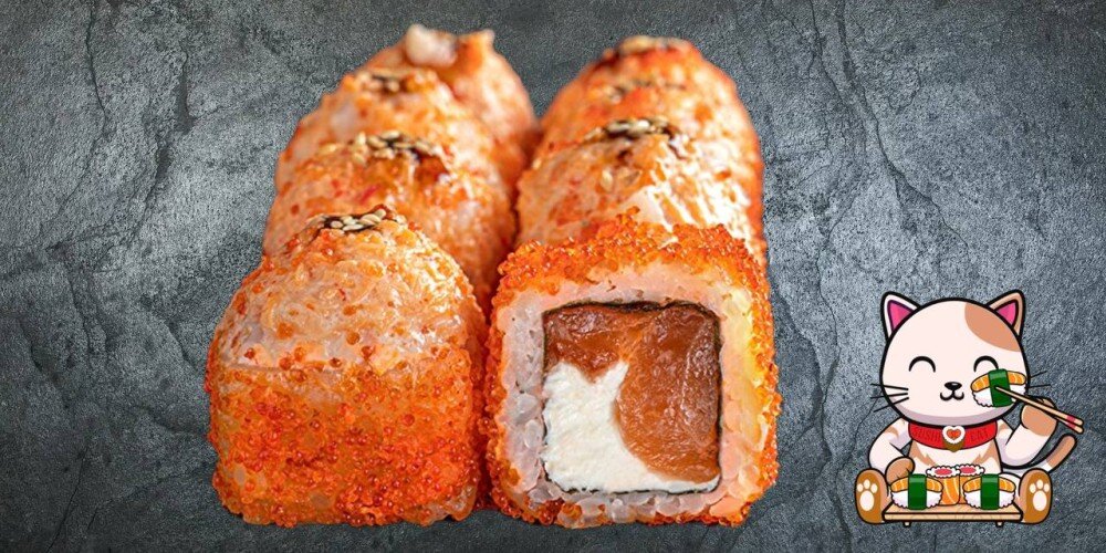 Рис, нори, свежий лосось, сливочный сыр, соус фирменный, терияки соус, кунжут, икра масаго, снежный краб, острый соус