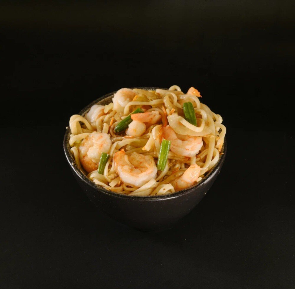Удон, перец болгарский, лук репчатый, морковь, тигровая креветка, фасоль стручковая, капуста пекинская, соус сладкий Чили, чесночное масло, микс кунжута